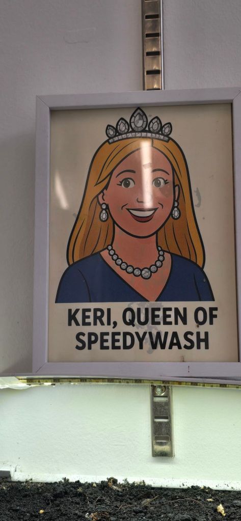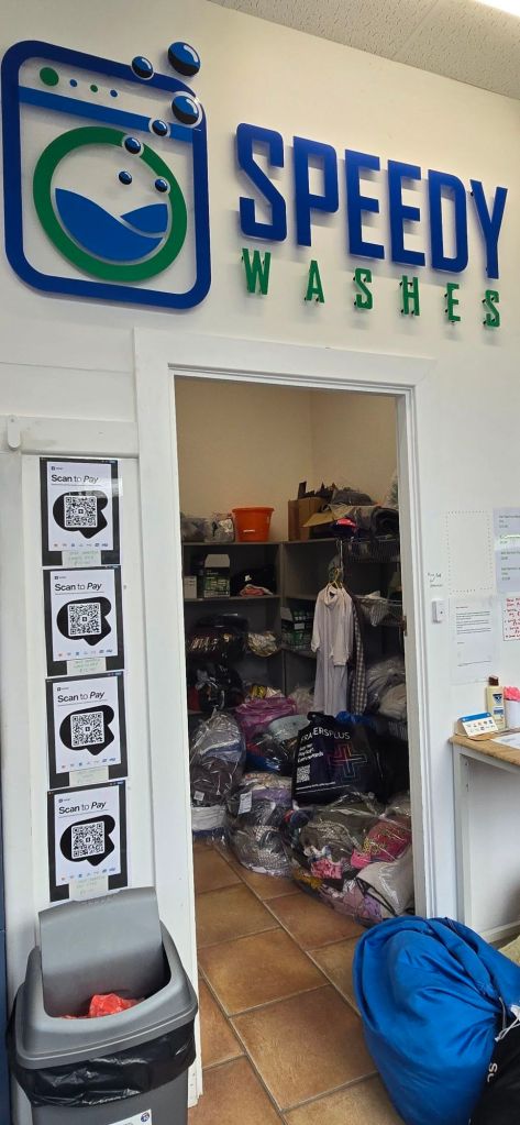 I found a charging station directly opposite a laundromat. The laundromat was, for first time users, please call. Well that wasn’t going to happen so we left and went to Speedy wash. Great place and staff apart from a prominate national flag! Had a long chat with Keri, the owner.