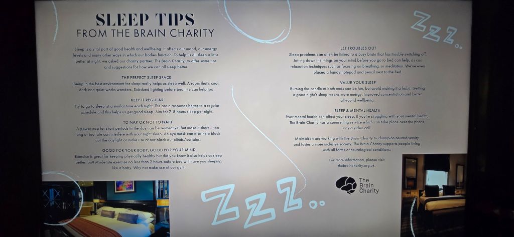 Back at the room, the bathroom fan was still running😱😱😱. I called reception to find out how to turn fan off as it is annoying. If I could see them, I suspect they would have had that blank look on their face, as most people seem to do when I ask something. They made some helpfull suggestios, trying turning all switches off and on, take the master key out (so no light or power, don’t think so), close bathroom door, read the ‘sleep tips’ on welcome screen . . .